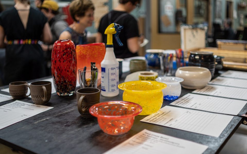 tables displaying an array of donated works as the Saturday sun begins to set.