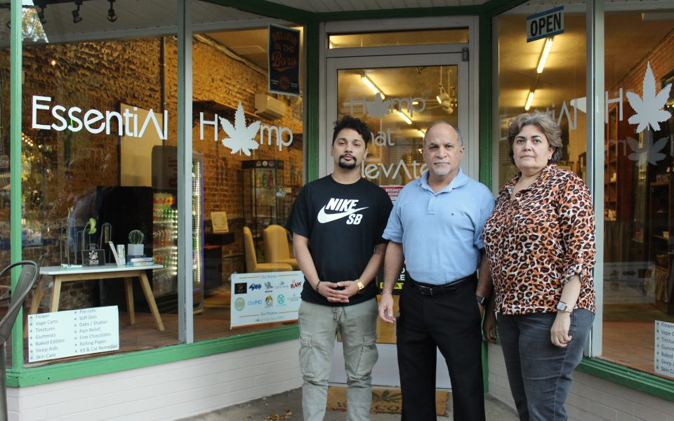 Featured photo: From left to right, Gabriel Sanchez, Hector Sanchez and Kattya Castellon stand in front of their shop, Essential Hemp in downtown Greensboro. (photo by Sayaka Matsuoka)
