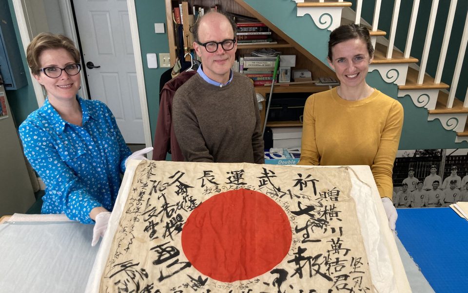 Featured photo: L-R: Season Nye, Glenn Perkins, Ayla Amon with the Greensboro History Museum, pose with a yosegaki hinomaru they found in their archives in 2023. The flag is currently being held by the OBON SOCIETY while their volunteers search for descendants of the flag owner in Japan. (photo by Sayaka Matsuoka)