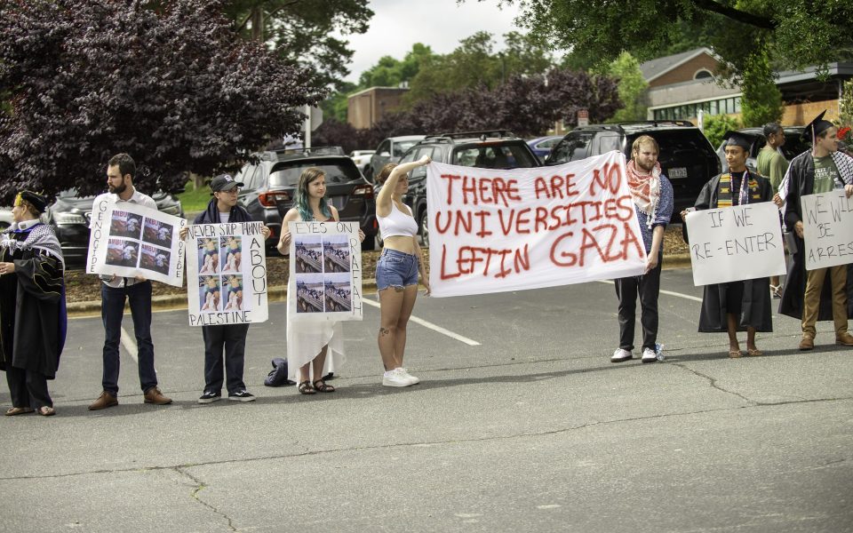 As hundreds of students, faculty, staff and family members walked out of Guilford College’s Ragan Brown Field House on the morning of May 18, a small group of protesters stood in the parking lot holding signs in support of Palestine. Among the group were two graduates of the class of 2024 who were not allowed to walk during the commencement ceremony that had taken place just an hour before due to their involvement in the planned protest.