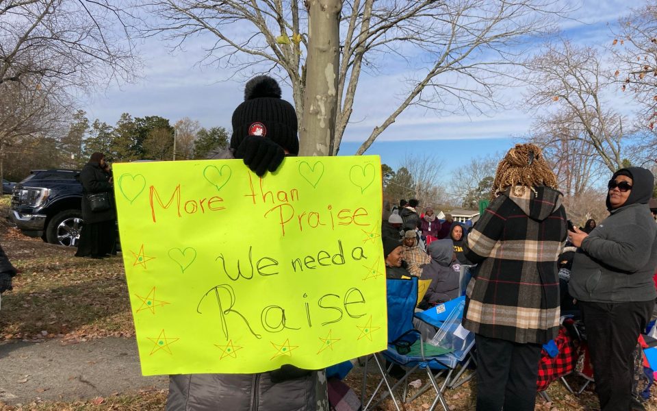 Featured photo: Guilford County Schools cafeteria workers hold up signs during their second day of protest on Nov. 28. (photo by Sayaka Matsuoka)