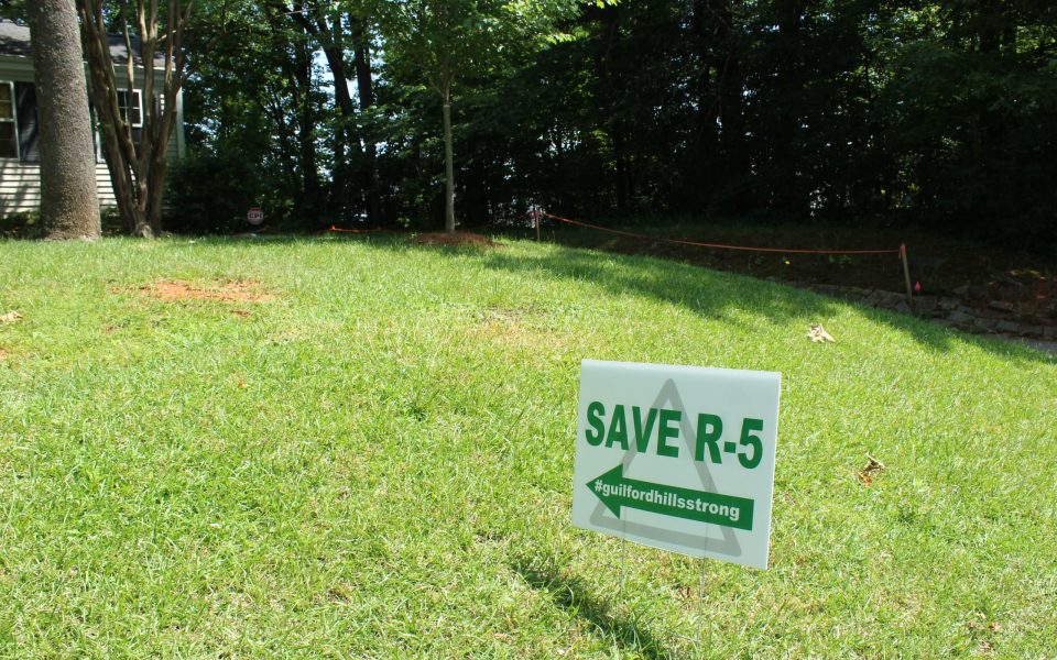 Dozens of white plastic signs that read “Save R-5 #guilfordhillsstrong” mark the yards all the way down Markland Avenue where Leung lives.