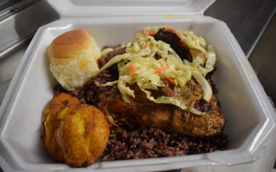 Rice cooked with black beans kept warm in the large cooker provides a base for many of the dishes, the traditional jerk chicken for instance. The tender meat — your pick of light or dark— falls readily off the bone and carries enough spice to create some heat. (For reference, anyone comfortable eating a “medium” salsa from the grocery or a spiciness level 2 at Southeast Asian restaurants should handle it well.) A complementary vinegar-pickled carrot and shredded green cabbage combination — known as “pikliz,” a popular Haitian condiment when accompanied by peppers — garnishes the chicken. This staple dish is served with a somewhat unnecessary dinner roll and yellow plantains fried just long enough to bring out the starchy fruit’s natural sweetness and produce a crispy casing. You’ll need to look elsewhere if you pine for the gooier, sugar-saturated variant.