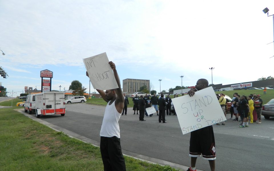 The rally drew a diverse crowd that included young families, members of the Nation of Islam and students from Reynolds High School, Forsyth Tech and Wake Forest University. Lining Martin Luther King Jr. Drive near the intersection of New Walkertown Road, they chanted, “We’re all Michael Brown” and “Put your guns down and your peace signs up.” They flashed peace signs, modifying the “hands up” posture displayed by demonstrators in Ferguson over the past two weeks.