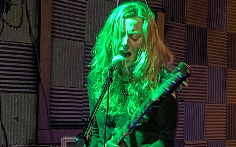 low-lit chandelier, Solar Halos’ lead vocalist and guitarist Nora Rodgers sang
