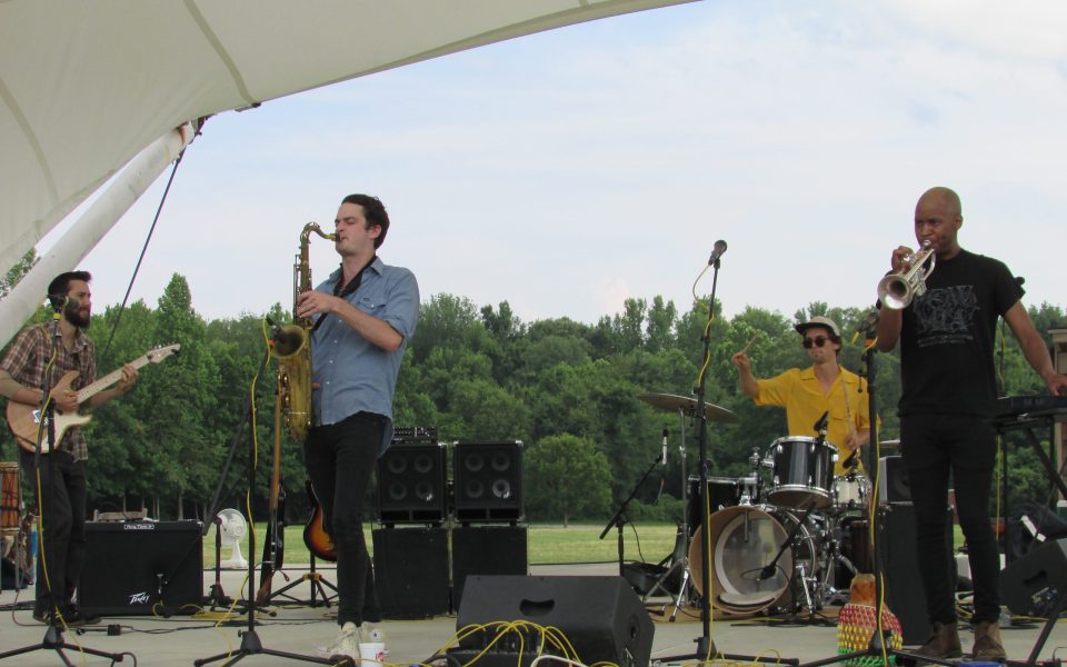 A smattering of fat raindrops had intimated at the threat of a downpour on the west side of the city, but it looked like there might yet be a reprieve. The lawn swooped up from the stage between two radiating rows of pine trees and listeners reclined on lawn chairs, juggled batons or meandered over to Preyer Brewing’s beer tap.