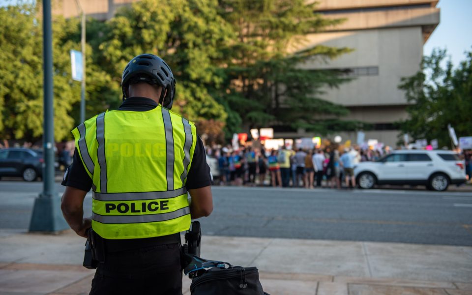 Featured photo: Greensboro police officers stand across the street from the Greensboro rally for reproductive rights in Greensboro N.C., on June 24, 2022. (photo by Juliet Coen)