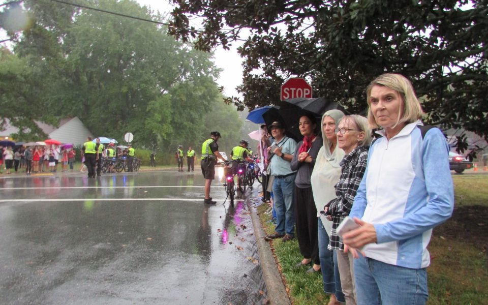 Onlookers lined Cleburne Street to get a glimpse, give encouragement or shout disgust, as bicycle officers held a line. Then a Greensboro police squad car whipped around and blocked Cleburne, creating a moment of confusion before the crowd realized the motorcade had been rerouted to Cornwallis, setting off a scramble to the other street.