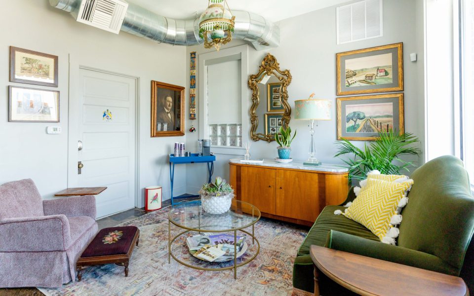 At the top of the sitting room in the Huntley House hangs a chandelier with dangling emerald green pendants and a delicate floral design on two glass globes. Like many things in this place — which is owned by husband-and-wife team Will Spencer and Christy Cox Spencer — it’s a throwback to an older era.