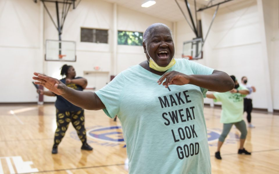 Featured photo: Pamela Benton, co-instructor of the H.Y.P.E. dance group, laughs during a routine at the William Roscoe Anderson Jr. Community Center in Winston-Salem. (photo by Juliet Coen)
