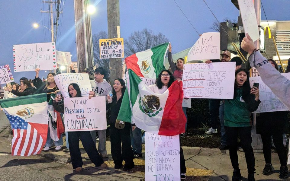 Over the next few hours, hundreds of people gathered at the intersection of Gate City Boulevard and Holden Road in the city, standing on sidewalks, chanting “Viva México” and singing along to songs blasted through a large bluetooth speaker. By around 5 p.m., law enforcement had shown up to block off the road and allow people to continue protesting safely.