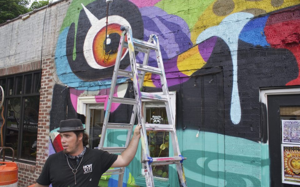 It’s fitting that when a street artist with a name like that rolls through town — traveling from Charleston — that he would end up in the city’s unofficial Whisky District, throwing paint on a wall. With more than eight crates of spray paint set before him on a table in Common Grounds’ parking lot, the increasingly popular muralist set to work.