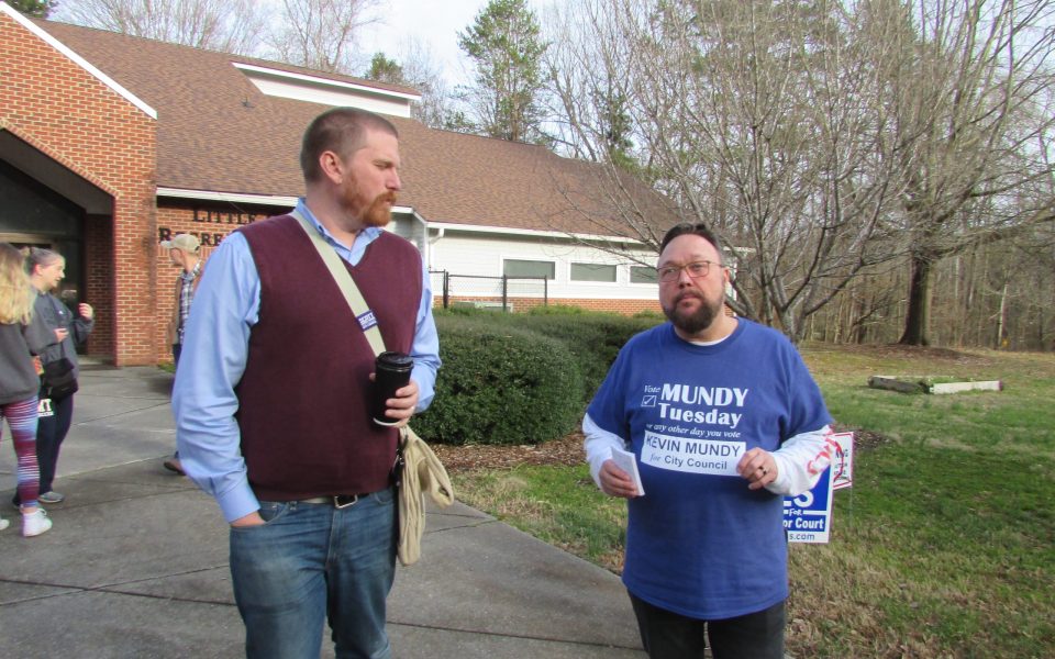 Photo: Southwest Ward opponents Kevin Mundy (right) and Scott Andree Bowen campaign outside the Little Creek Community Center in Winston-Salem. (photo by Jordan Green)