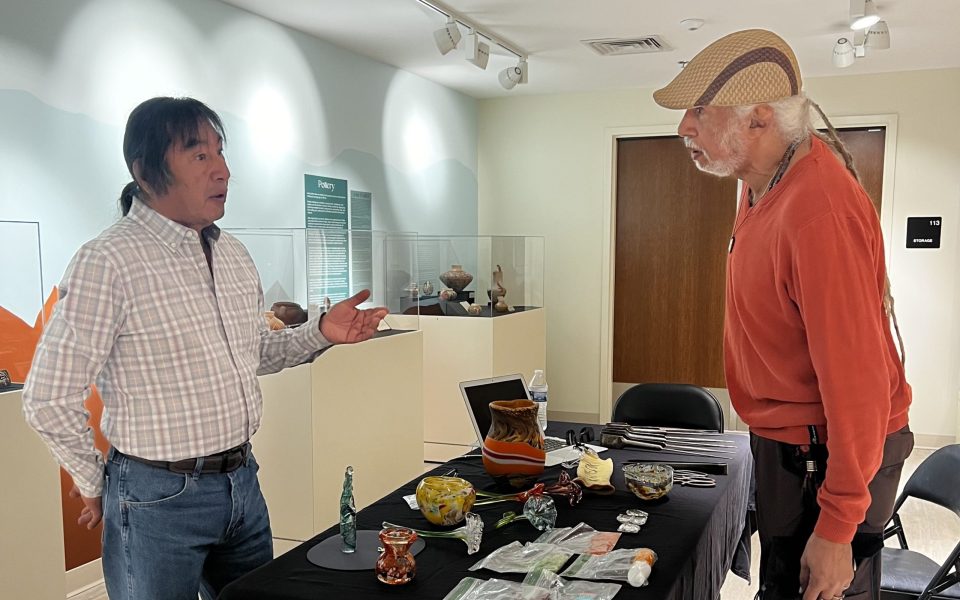 Translucent shapes standing on his table echo the curves of earthenware jugs in the exhibit surrounding him. Glass-blowing is not a traditional Hopi artform, but Lomatewama has embraced it, melding this form of expression with his own cultural background to create something unique and valuable. Still, he continues to work to preserve his culture. He helped the museum staff at Lam by going through their materials, filling in catalog gaps, particularly in their Hopi collection.