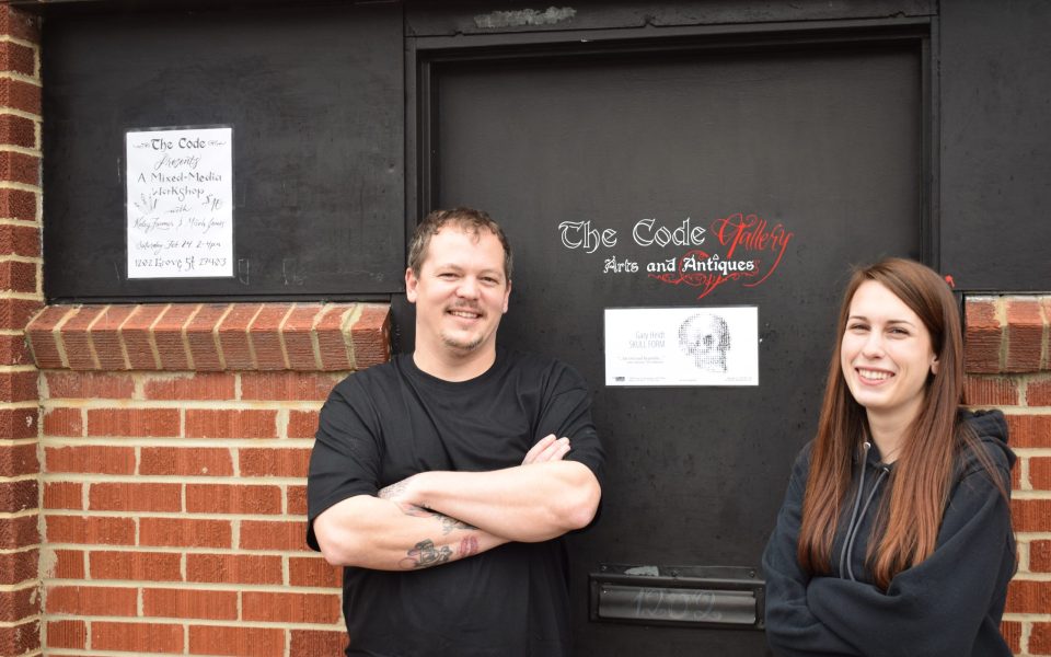 A few doors down from Glenwood Community Bookshop, before crossing Glenwood Avenue to the Grove Street Market parking lot, a matte black door that led to heaps of rubble less than a year ago now opens into the Code Gallery. The name is painted in white and red Gothic script, fitting for the two tattoo artists-turned-gallery curators: Kaley Farmer and Micah James.
