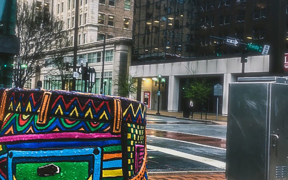Center City Park lays bare, empty as the First Friday Drum Circle postpones its jam session. Sheltered underneath a balcony, a man works his saxophone, sending woody notes through the drumming of the rain. Passersby can see the Voices of God’s Children Community Choir performing through the glass panes in front of the International Civil Rights Center and Museum, and some duck inside to listen.