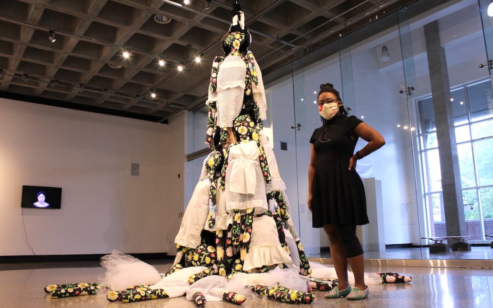 Artist Jasmine Best stands next to her piece, “Pulled Out At the Root,” in the Gatewood Gallery at UNCG. (photo by Sayaka Matsuoka)