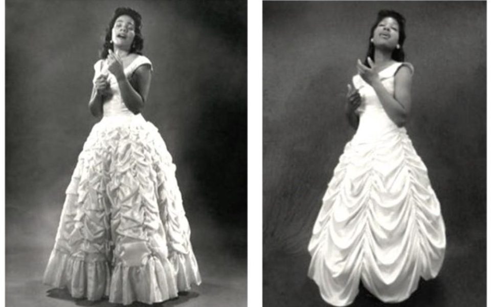 In a shot next to King’s photograph on the right, Greensboro artist Jasmine Mallory takes the same pose but in a slightly different dress. She’s styled her hair the same, her hands positioned in similar fashion.