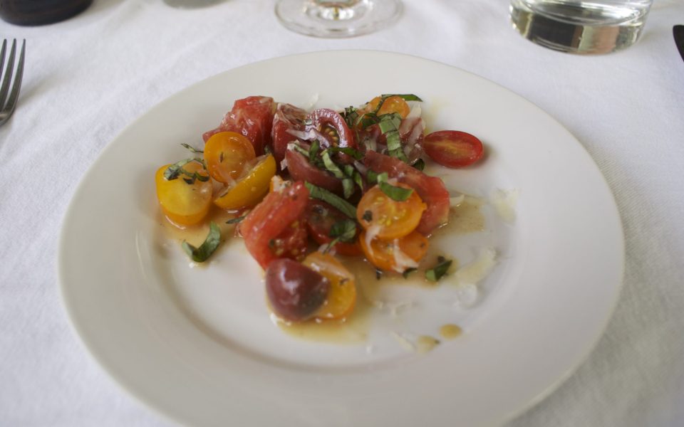 Reflecting a month later, my memory of the food pulled in slices of the evening. There was a buttermilk soup of some sort to start, a concoction with a Japanese influence and an egg later on, a plate of various delicious tomatoes and an unusual cantaloupe tequila poured in a tall shot glass. Oh, and some peaches with cheese — goat, I believe — drizzled with honey and something green, maybe basil.