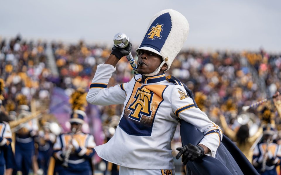 Headed by Dr Kenneth Ruff, The A&T marching band, known as the Blue & Gold Marching Machine, has been recognized nationally for its polish and originality. They play all the time — for high schools and during A&T home football games; they played in the 2012 Macy’s Thanksgiving Day Parade, during halftime of a Detroit Lions football game last year and for VP Kamala Harris when she visited A&T earlier this year. This year they were invited to play in the Tournament of Roses in California, a prestigious event that only 20 bands nationwide were invited to join. The BGMM is currently preparing for GHOE (The Greatest Homecoming on Earth), which will run from Oct. 29-Nov. 5. GHOE is huge, bringing A&T alumni in from decades past by the thousands, as well as drawing enormous crowds of non-alumni.