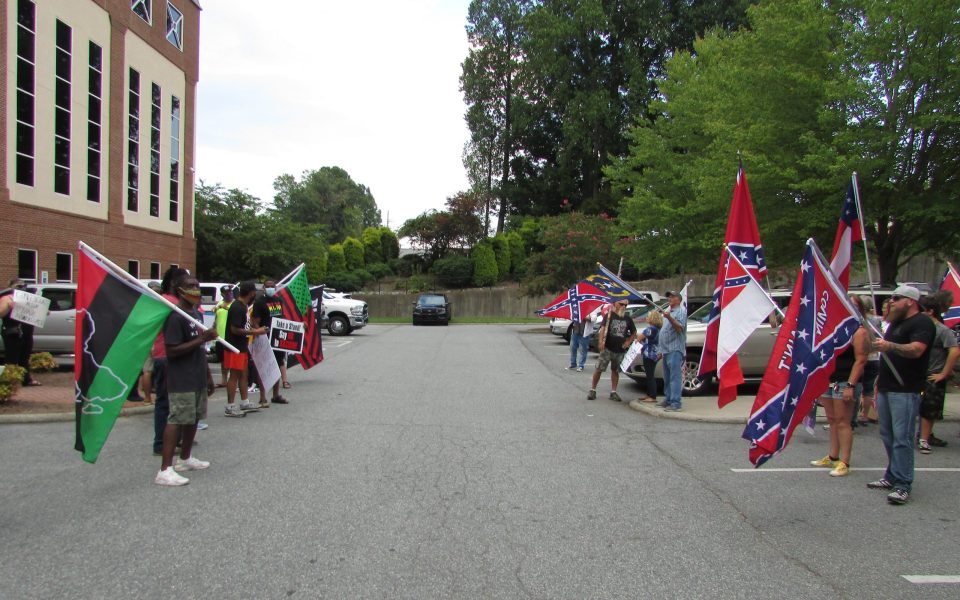 Antiracists and neo-Confederates face off at the Davidson County building in August. (photo by Jordan Green)