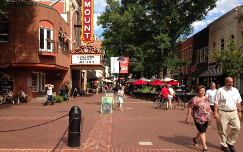 I was relaxing near a fountain on the Downtown Mall in Charlottesville, Va. waiting for my friends after an intense hour or so of KKK protest-reporting duty. It was a breathtaking scene: a café with seating for maybe 50 people that reminded me of Café du Monde in New Orleans, more café tables shaded by parasols set into the heart of the thoroughfare, a historic theater, restaurants, bookstores and pie shops, two ice cream stores, elderly couples strolling and cyclists making a leisurely pass.