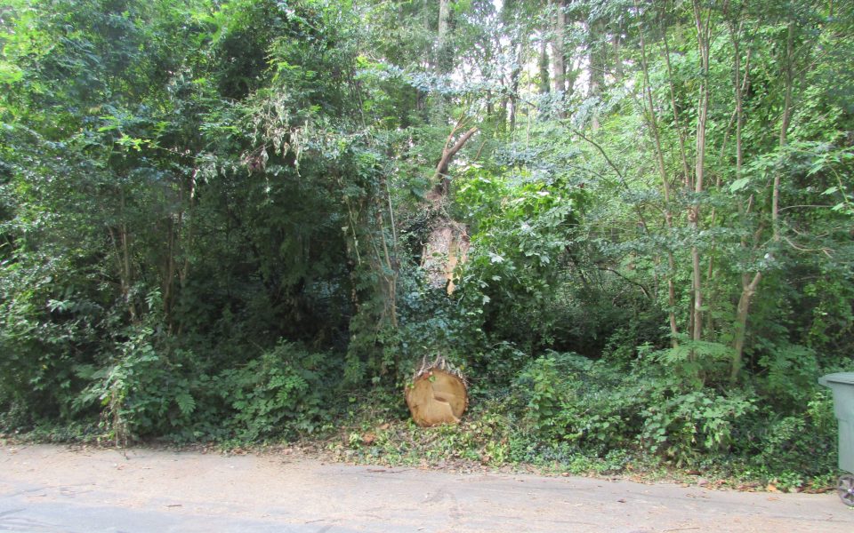 I couldn’t help but think as I watched a battalion of tree trimmers and utility trucks roll in to the neighborhood that Duke could have saved a huge amount of expense and trouble — with minimal expense and absolutely no intrusion — by simply hiring someone to pull the damn ivy off that tree. In comparison to the butchery committed in Westerwood two years ago when contractors toppled trees and dropped limbs, no one in my neighborhood on the west side of Lindley Park would have complained one bit about them removing ivy.