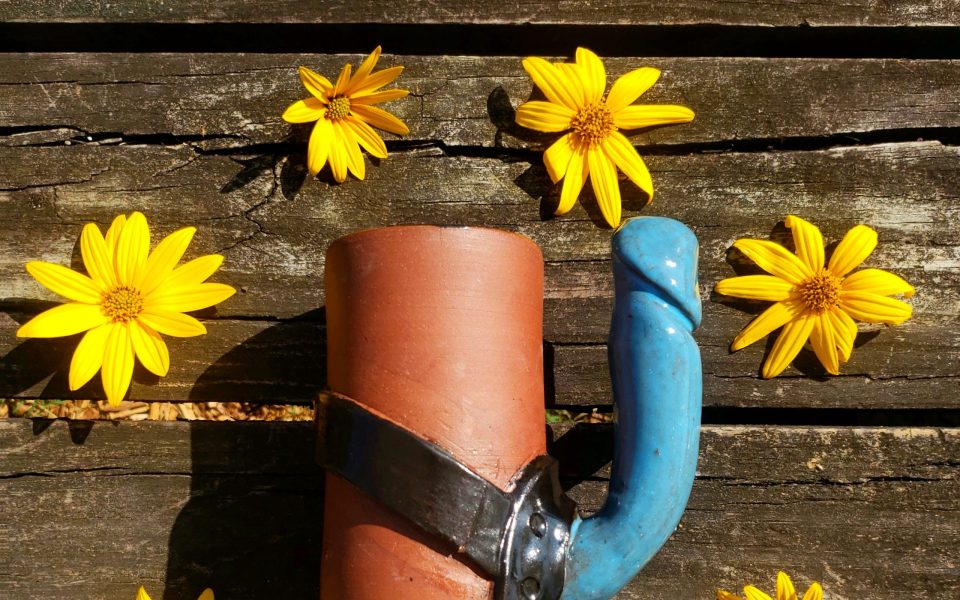 While all of the artist’s piece are striking, some of the most eye-catching forms include her strap-on dildo mugs upon which she hand alters variously colored dildos into handles for the wheel-thrown terracotta drinkware she creates. They’re artistic for sure, but also meant to be functional, she says.
