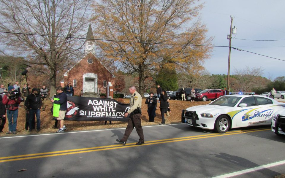Anarchists and militant leftists, mostly from the Raleigh-Durham area, converged at a visitor center, with reconnaissance teams trying in vain to locate the Klan. After relocating to a gravel lane outside the Pelham Community Center, about 150 counter-demonstrators huddled and decided among themselves to march to a nearby church.
