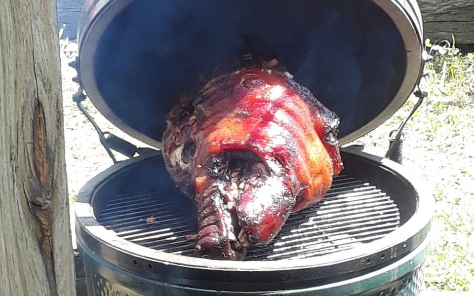The afternoon sun beams down through a grove of trees; blue smoke filters, dancing through each stream of light. It wafts out from pits of fire, wood and glowing gray ash. A pig’s head roasts on a grill. Its teeth and jawbone jut from its mouth, like in Lord Of The Flies. One hand douses it with a thick red sauce and the lid closes down. A row of ducks hanging by wires jiggle, twirl and drip on a spit until they burst open above glowing coals and an earthen vessel filled to the brim with leafy greens. Someone pays homage to a whole dressed lamb by kissing its hindquarters before breaking it down with a boning knife and a hacksaw. The soundtrack to this scene is a funk/soul band whose electric guitars and rhythmic grooves echo throughout the valley and rise up to the top of the hill where guests in tents rest and await their next move.