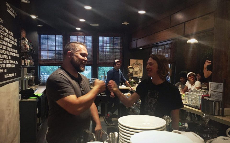 The espresso beans are ground, transferred to the portafilter and tamped. The barista affixed the group head to the machine’s body and heated water cascaded through the metallic filter basket. Chestnut-brown, caffeine-riddled liquid dripped into the shot glass. Meanwhile, steady hands guided a pitcher around the steam wand, introducing air and then steam to the cold milk. On a typical night, this process culminates in a transaction between customer and establishment, but on Sunday evening the ritual played part in a celebration of community.