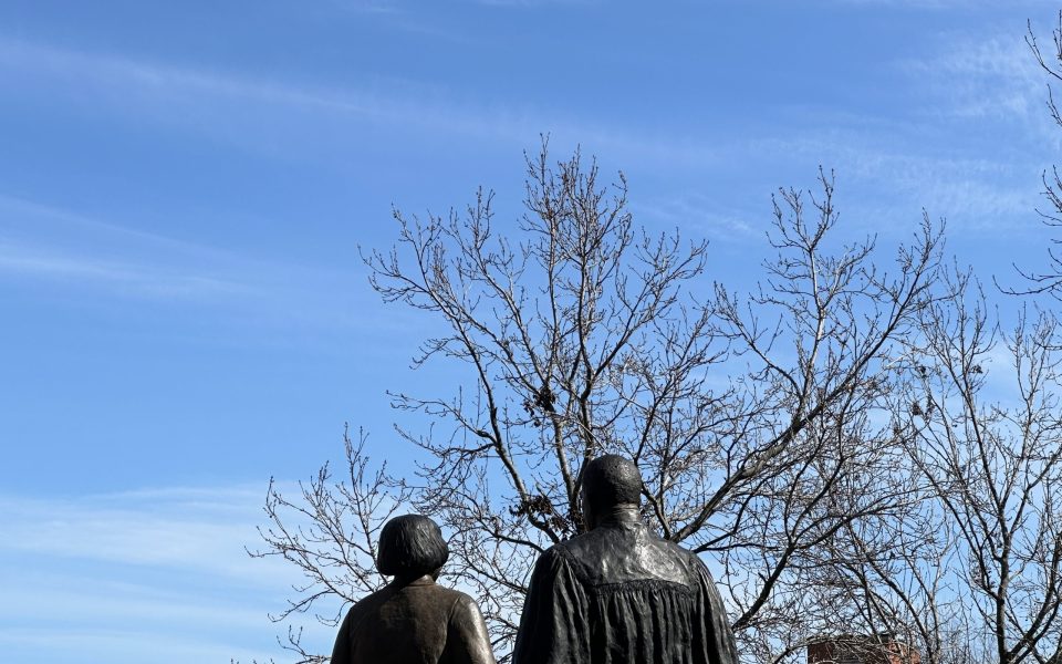 Featured photo: The newly unveiled statue of Henry and Shirley Frye watches over Center City Park. (photo by Gale Melcher)