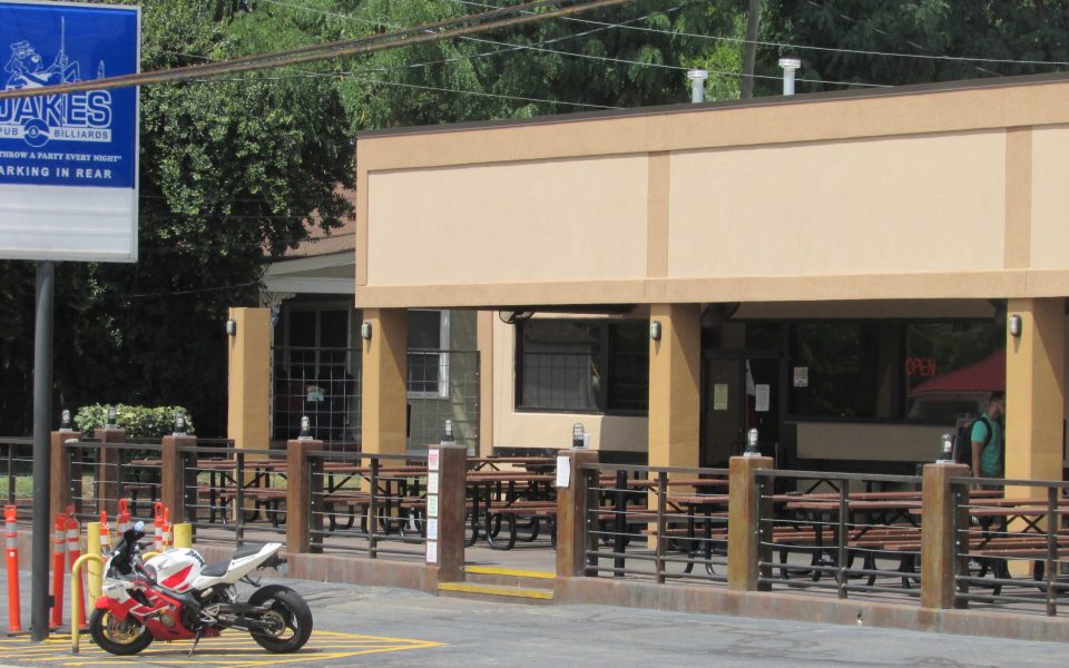 Similarly, I applaud Jake’s Billiards, the bar on Spring Garden Street that is renowned for its extensive craft beer selection and fair employment practices. In late 2013, the management closed off the parking lot in front of their establishment and replaced it with a large, partially covered deck. Spring Garden Street is a lovable hodgepodge of traditional storefronts and suburban-style buildings with parking in front. By eliminating the front parking lot, Jake’s urbanized its property and reoriented it to the street, creating a vital interface for pedestrians. The ample parking lot in the back is nearly always full, but they compensate by making their establishment more appealing to students and others who live and work around UNCG, who can walk or bike to meet friends for a late-afternoon drink. The deck has a democratic feel, with service-industry humps, professors and students, and members of the creative underclass jostling elbow to elbow at the long tables.
