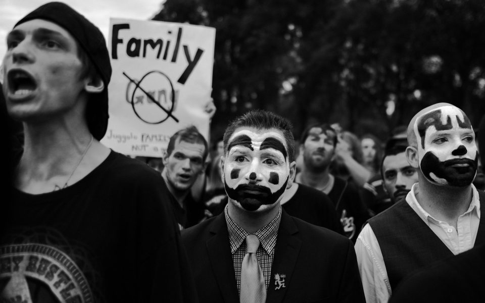Several observers have detected a kind of nascent progressivism in the juggalos — a line that Nathan Rabin, a sympathetic Insane Clown Posse biographer, is promoting. As Rabin told Scott Simon on NPR’s “Weekend Edition”: “If you actually look at the music and the lyrics of the Insane Clown Posse, it’s very class conscious, it’s very anti-bigotry, it’s very anti-redneck, it’s very anti-racism. So if you actually look at the words and the ideology, it’s very leftist, it’s very progressive. At the same time, Insane Clown Posse and most juggalos consider themselves very apolitical. ICP in particular have walked this very fine, weird line, where they’ve said we’re going to throw this political rally, but it’s only about this one issue about the FBI designating our fans this hybrid gang. So, what I would like would be for this to be the start of something, you know, for them to take on profiling in all its forms — police brutality, government overreaching, law enforcement persecuting people on the basis of how they look.”