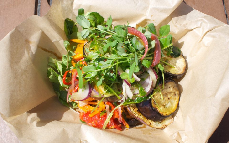 He pauses before handing me the Farmer’s Market Vegetarian Entrée — a beautiful and bright salad with eggplant, pea shoots and assorted local vegetables — to take a picture of it on his phone, posting it to Instagram and tagging the Coffee Park. Pink, orange and red colors of tomatoes, peppers and onion jump out against the greens; it’s easily the most colorful meal I can remember eating. (see above)