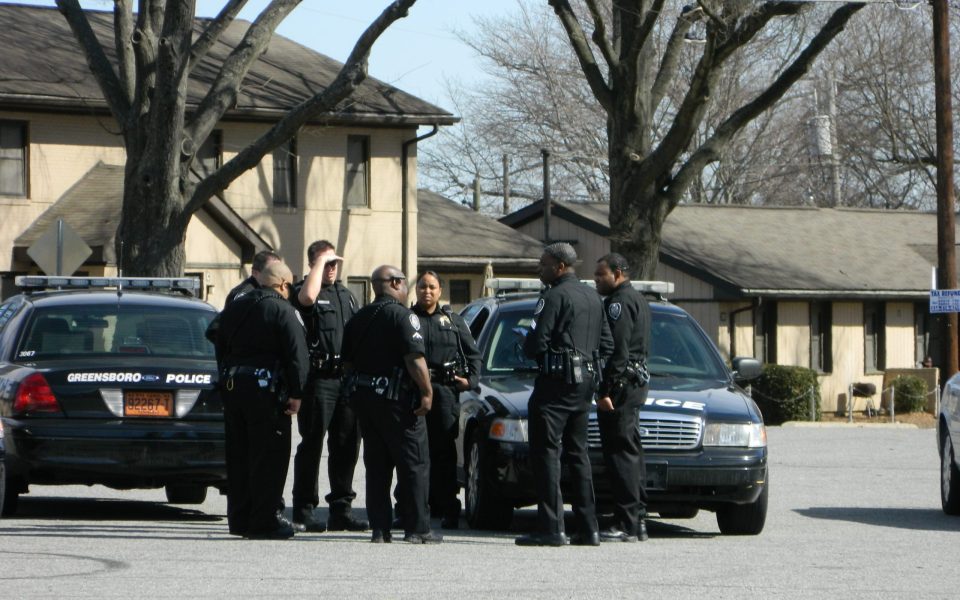 Greensboro police officers convene in the parking lot of the Freeman Mill Square shopping center adjacent to the Smith Homes public housing community to discuss video technology at lunchtime.