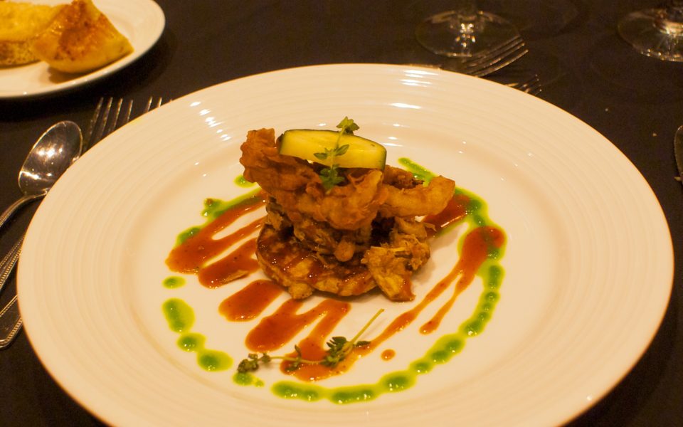 Everyone at my table and two other food writers in attendance agreed that the night’s second course rocked the evening. Using the evening’s surprise ingredients — molasses and pheasant — Miller and company presented a pheasant confit atop sausage and pheasant liver cheddar grits and accompanied by red pepper cucumber relish, an incredible sorghum juniper berry gravy and cornbread. My tablemates and I wondered if the addition of charred sorghum Vidalia onion pearls had been an intentional signal from the Vidalia chefs to their supporters in the audience, a giveaway as to who prepared the secret dish.