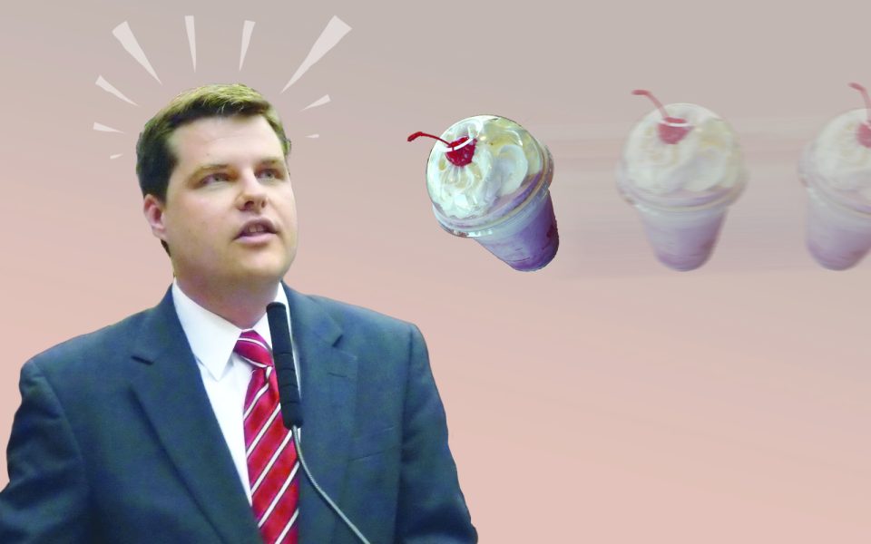 Like all great British trends, it’s coming to the US. The flouncy hate machine Milo Yiannopoulis has been recently milkshaked. And on Saturday, US Rep. Matt Gaetz (R-Florida) got milkshaked after leaving a town hall at the Brew Ha Ha in Pensacola.