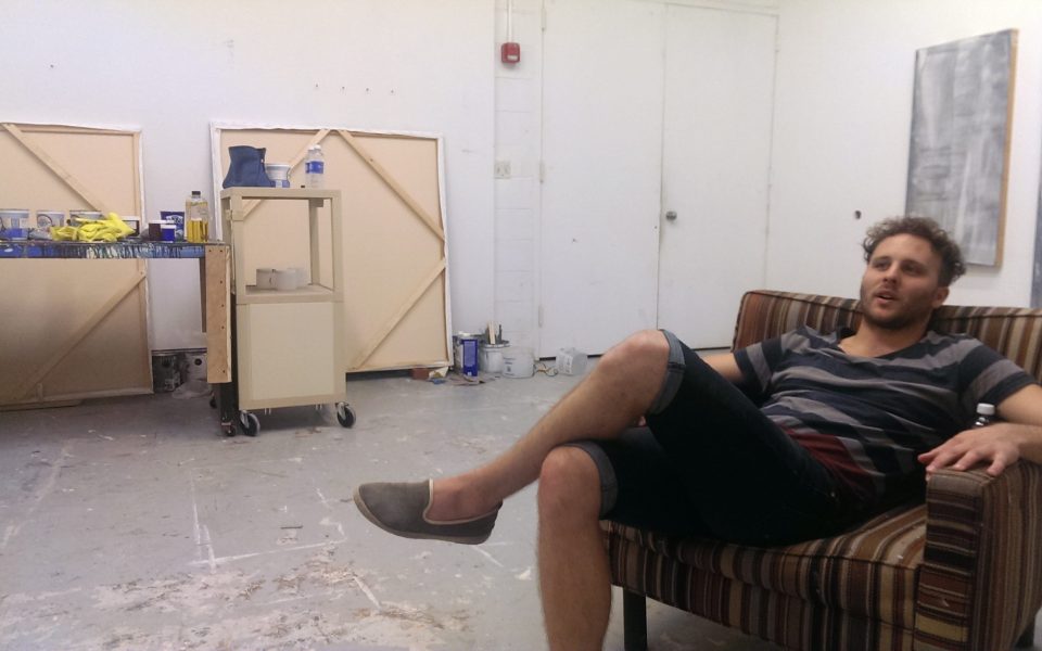 Canvases line the walls of the bright studio, interrupted only by a single guitar that hangs in the corner of the room. Empty paint buckets rest on the floor next to boxes brimming with tubes of paint. In the center of it all, Travis Phillips lounges in a striped, paint-splattered armchair. The studio, just off of Airport Drive in Chapel Hill, is his second home.