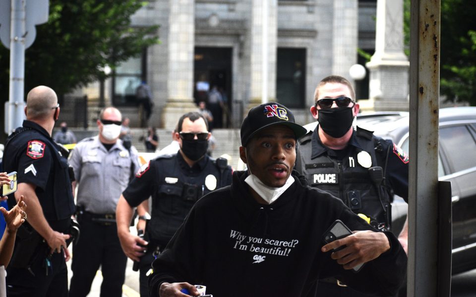 Following the imposition of the protest ban, Matthew Edwards of Burlington held a sign reading “Black Lives Matter” next to the Confederate monument on June 27. Photographer Anthony Crider reported that Graham police grabbed Edwards’ sign and arrested him, while ordering everyone else including media, to leave. Two police officers forced Edwards to the ground as they placed him under arrest. He faces misdemeanor charges of resisting a public officer and fail to disperse on command.