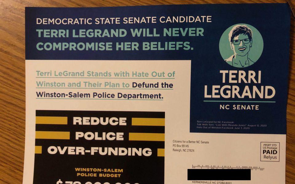 “Terri LeGrand stands with Hate Out of Winston and their plan to defund the Winston-Salem Police Department,” the mailer says.