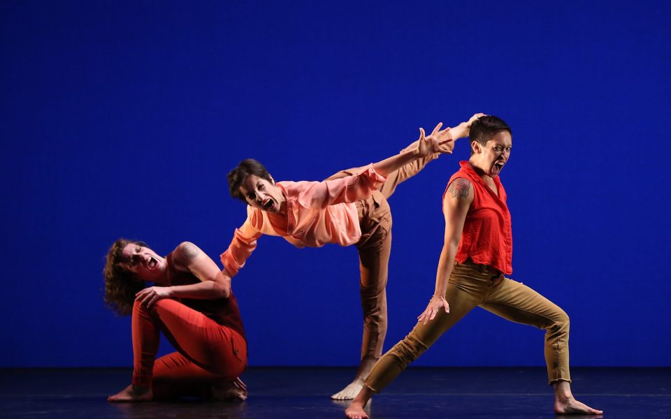 Striking violet lighting accompanied heavy drumming and guitar as the women spun into an athletic, free-form sequence. Breathing heavily, they approach the audience, saying, “I’m still here,” and banded themselves into a jigsaw, all three faces gazing outward not inches apart.