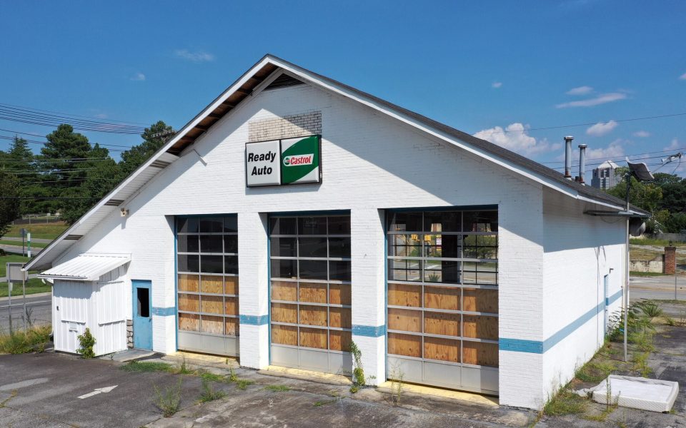 The two buildings located at 1013 Battleground Avenue have long stood empty. Located at the junction of Benjamin Parkway and Battleground Avenue, the lot includes an old gas station and car-repair shop. An old sign that reads “Rusty Gas and Convenience” gives passersby an indication of the lot’s former life. The location sits at the entrance of downtown, is located close to the Westerwood neighborhood and has neighbors including Bee Safe Storage across the street and the new office building at 1007 Battleground Avenue.