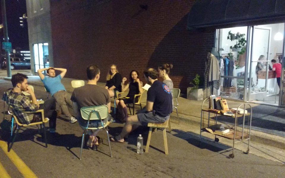 A cool wind swept down the corridor of Sixth Street, pushing away the thick, lingering heat that had been pressing down on the circle of readers gathered in the street outside of Kleur in downtown Winston-Salem on June 3. The breeze rustled the pages of The Little Prince, from which Christina Tyler read aloud to a quietly attentive audience of eight. Her voice carried over the social hum of First Friday, pausing to allow a fire truck to wail past.