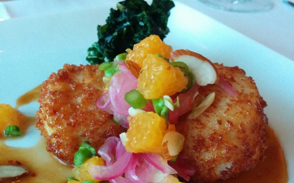 A final course brought a couple of massive panko-crusted diver scallops bathed in hoisin and blessed with sriracha, with a cold salad of Mandarin oranges and almonds for color and taste.