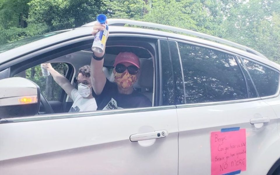 The protesters took turns reading from the 10 demands from the United for Survival platform — created and signed by more than 200 organizations across the state — said Gwen Frisbie-Fulton. As each car passed Berger’s residence, drivers honked while other banged pots and pans, organizers said in a press release.