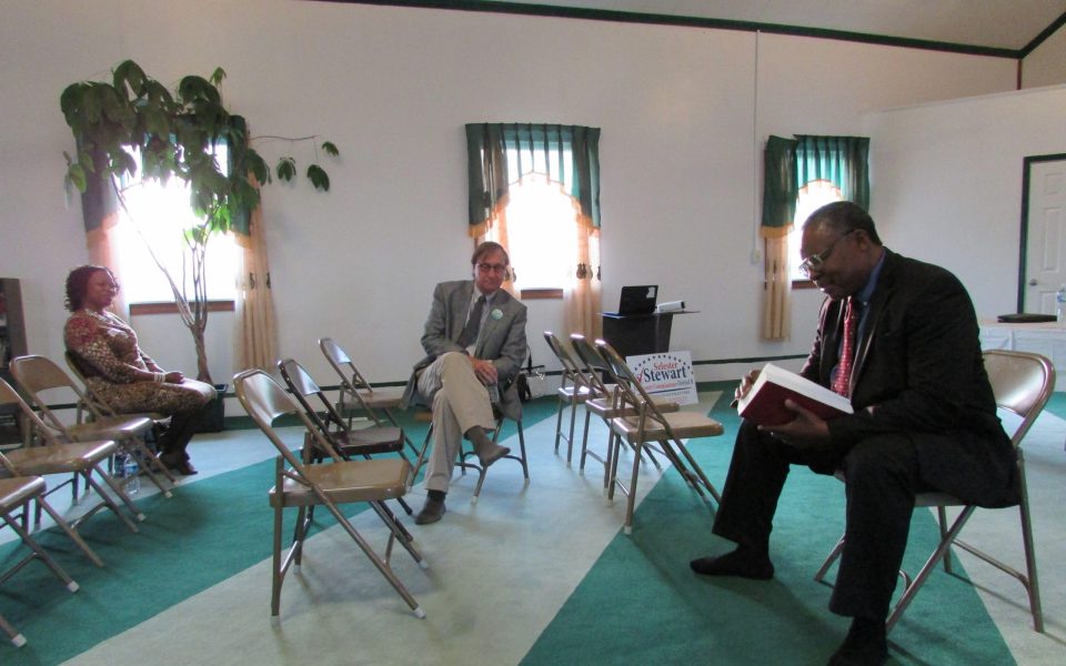 As El-Amin waited to see if any additional candidates would show up, the conversation naturally turned to the finer points of election administration, state election law and local poll-worker training. After about 15 minutes, El-Amin said he wanted to be respectful of everyone’s time and start the program. A circular seating arrangement was the one concession to the limited turnout in what was otherwise a fairly formal, if relaxed, format. El-Amin opened with a Muslim prayer and then offered Larson the opportunity to make an opening statement, inviting him to take all the time he needed.