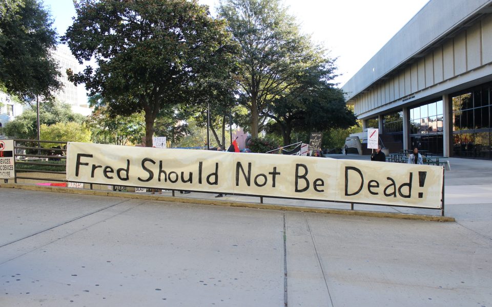 Chants of, “Fred should not be dead!” and, “Charge murderer Michael Shane Hill” rang out as a small group of activists appealed to those catching their early-morning court hearings.