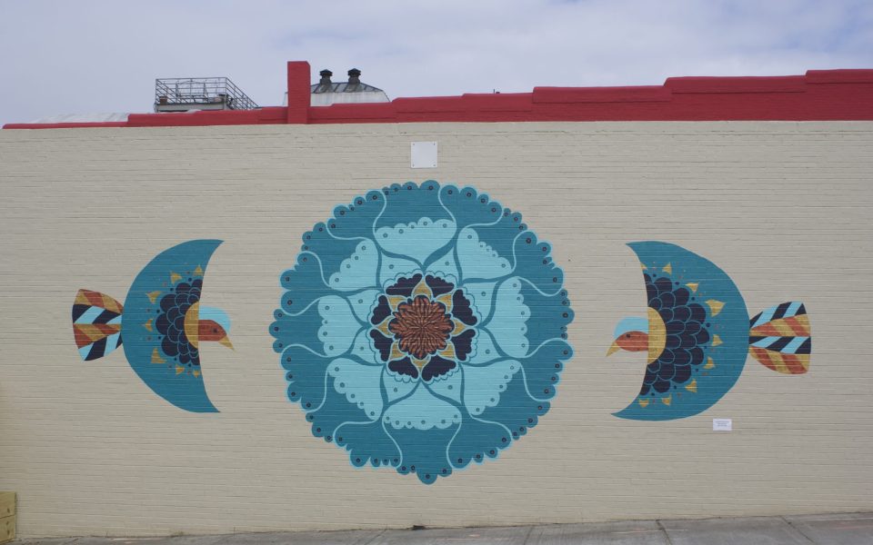 Laura Lashley applied a colorful mandala flanked by birds to the side of Small Batch Beer Co. on Winston-Salem’s Cherry Street after the brewery asked her to create something for a future outdoor patio. Teal, burnt orange and red converge in a kaleidoscopic mosaic that reminds one of bright, geometric Navajo prints.