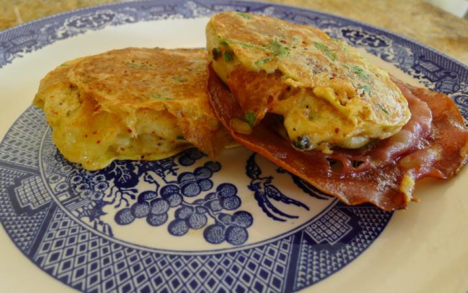 Making French toast out of pancakes involved an extra step of making blueberry pancakes first, but disaster was averted. After the school bus left I got back to work. Though I rarely eat breakfast, I was curious about those golden-brown disks of French toast pancakes. I’m not a sweet breakfast person; I like my eggs salty and spicy. I saw no reason why pancake French toast couldn’t be savory.